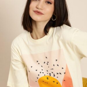 Women Cream- Coloured Printed Cotton Oversized Pure Cotton T-Shirt