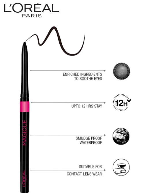 L’Oreal Paris India offers the complete range of makeup. You can volumize and lengthen your lashes with our collection of mascaras, achieve sleek lines with smudge-proof eyeliner, add natural looking definition to your brows and discover eyeshadow palettes. Create your perfect eye makeup look with L’Oreal Paris India!. Smudge Proof For Up To 12 Hours Non Transfer Waterproof . A New Generation Formula Powered With Mineral Pigments For Deep Intense Colour . Formulated With Care Ingredients & Enriched With Vitamin E, Cocoa Butter, Olive Oil Esters And Vitamin C . Suitable For Sensitive Eyes And Contact Lenses