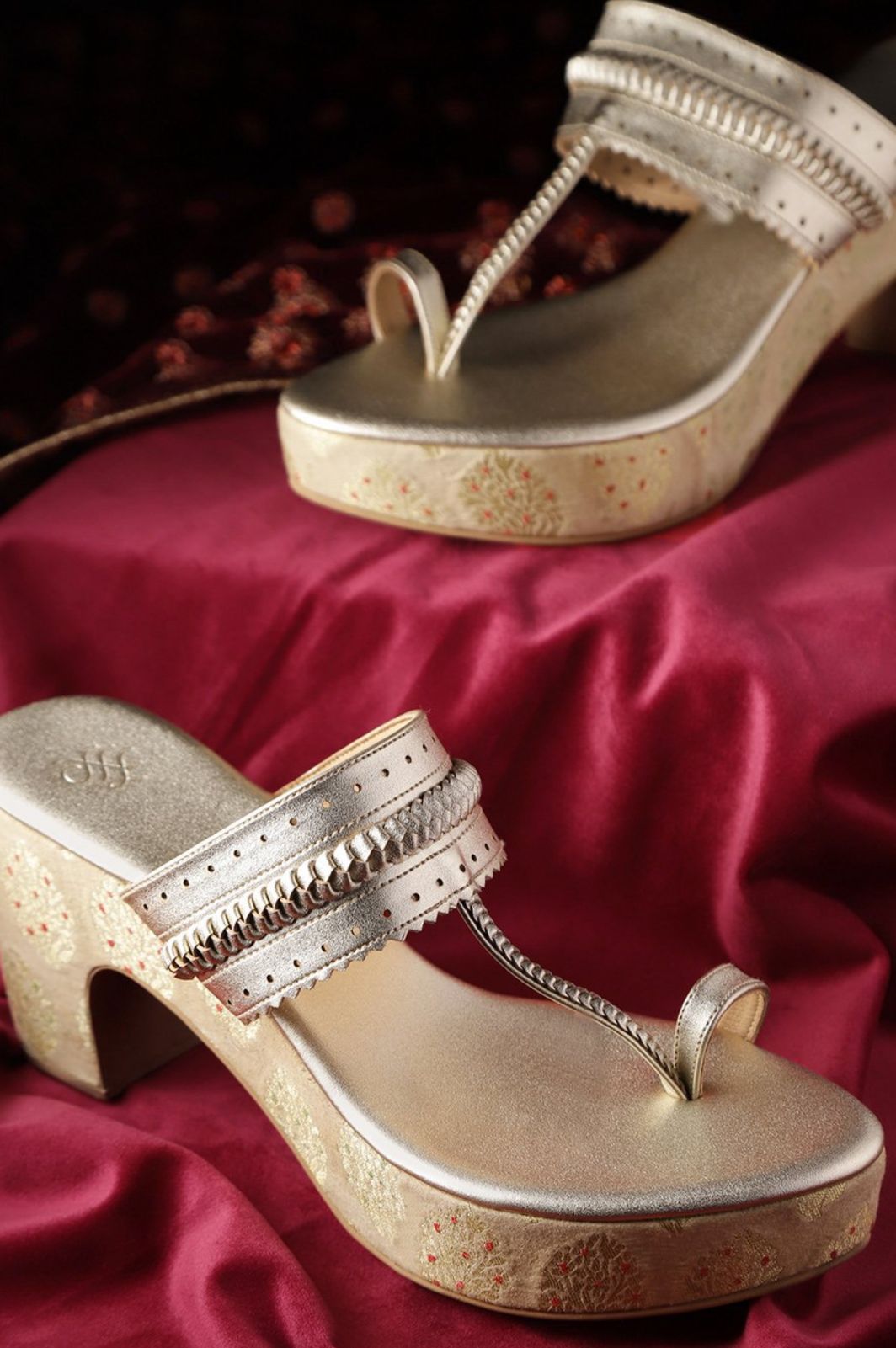 A pair of gold-toned braided and perforated detail handcrafted one-toe block heels, has regular styling, open back detail