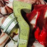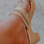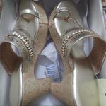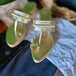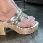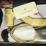 A pair of gold-toned braided and perforated detail handcrafted one-toe block heels, has regular styling, open back detail