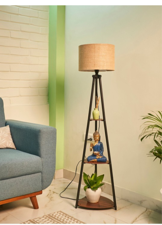 Beige & Black Metal Cylinder Shaped Floor Lamp With Shelves