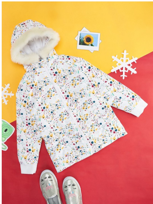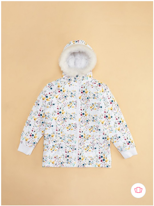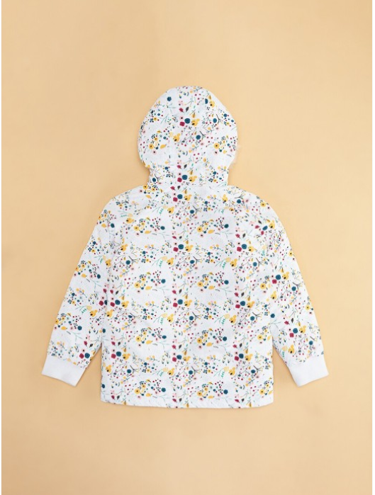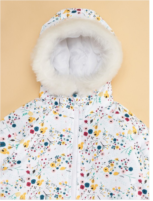 Off white and yellow floral printed padded jacket has a hood, 2 pockets ,has a button closure, long sleeves, straight hemline, polyester lining